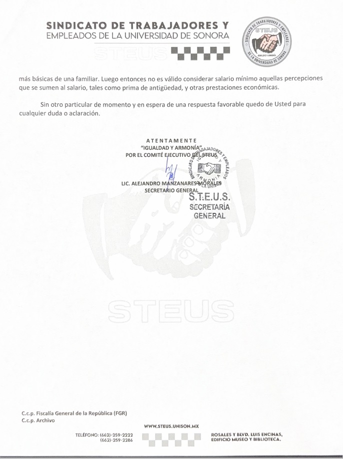 | El Comité Ejecutivo y la Comisión Revisora del STEUS, hacemos constar que no estamos de acuerdo con el ofrecimiento por parte de las autoridades universitarias, así como el hecho de no reconocer que tenemos niveles tabulares que se encuentran por debajo del salario mínimo. | ![]() |